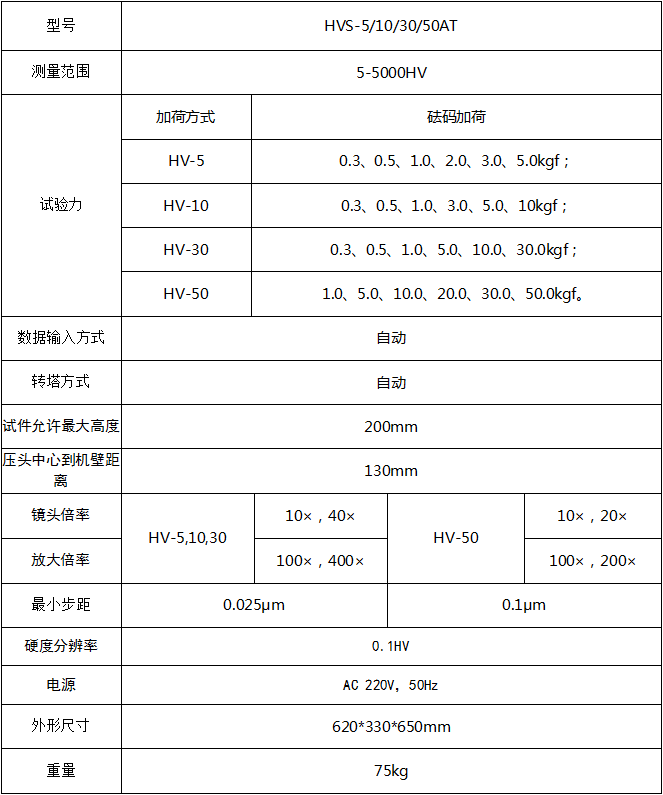 HVS-5/10/30/50AT觸摸屏數顯自動轉塔維氏硬度計 產品介紹 1、機身使用優等鑄鐵一次澆鑄成型,配合以汽車烤漆處理工藝,外形圓潤美觀; 2、配置了自動轉塔功能,高分辨率的測量和觀察物鏡,結合內置長度編碼器的高清數字測微目鏡,實現了壓痕對角線的一鍵測量,肖除人為操作干擾與讀數誤差; 3、便捷操作系統,可自動進行全硬度標尺的單位轉換; 4、可設置硬度值的上限值和下限值,當測試值超過設定范圍時,發出警報音; 5、具有軟件硬度值修正功能,可以在一定范圍內直接對硬度值進行修正; 6、具有數據庫功能,對試驗數據自動進行分組保存,每組可保存10個數據,可以保存2000個以上數據; 7、具有硬度值曲線顯示功能,直觀顯示硬度值的變化; 8、可選配CCD圖像處理系統,另可選配努氏壓頭進行努氏硬度測量; 9、配置無線藍牙打印機,并可通過RS232、USB接口輸出數據; 10、精度符合GB/T4340.2-2018 ISO6507-2 和美國ASTME384。 應用范圍 1、黑色金屬、有色金屬、IC薄片,表面涂層、層壓金屬; 2、玻璃、陶瓷、瑪瑙、寶石、薄塑料等; 3、碳化層和淬火層的深 度及梯度的硬度測試; 4、適用于平行平面和微小零件及超薄零件的精 密維氏測量。 技術參數 ![]() 附件配置