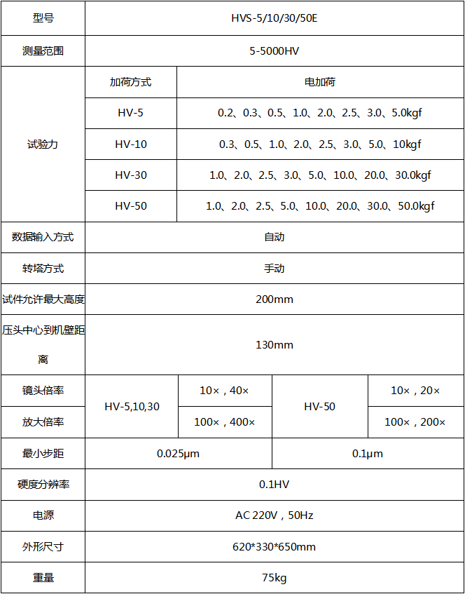HVS-5/10/30/50E數顯維氏硬度計 產品介紹 1、產品機身部分由澆鑄工藝一次成型,并經過了長時間的時效處理。相對于拼板工藝,長期使用形變量小,并可有 效適應各種惡劣的環境; 2、汽車烤漆,漆質檔次高,抗劃傷能力強,使用多年依然光亮如新; 3、高 級光學工程師設計的光學系統不僅圖像清晰,還可作為簡單的顯微鏡使用,亮度可調,視覺舒服,長時間操作不容易疲勞; 4、采用高分辨率的測量和觀察物鏡,結合內置了長度編碼器的高清數字測量目鏡,實現了壓痕對角線長度的一鍵測量,擺脫了讀取過程中手動輸入的誤差和煩惱; 5、具有較高的測試精度,操作簡單、靈敏度高、使用方便,示值穩定等特點;采用電子閉環控制施加試驗力;完全實現了試驗力的自動施加、保持、卸除、硬度值直接顯示等功能。結構模塊化設計,開機即用,無需安裝砝碼; 6、可選配CCD圖像處理系統以及視 頻測量裝置; 7、配置了藍牙模組,藍牙打印機,并可選配藍牙PC接 收器實現無線打印和無線數據傳輸; 8、精度符合GB/T4340.2 ISO6507-2 和美國ASTME384。 應用范圍 1、黑色金屬、有色金屬、IC薄片,表面涂層、層壓金屬; 2、玻璃、陶瓷、瑪瑙、寶石、薄塑料等; 3、碳化層和淬火層的深 度及梯度的硬度測試; 4、適用于平行平面和微小零件及超薄零件的精 密維氏測量。 技術參數 ![]() 附件配置